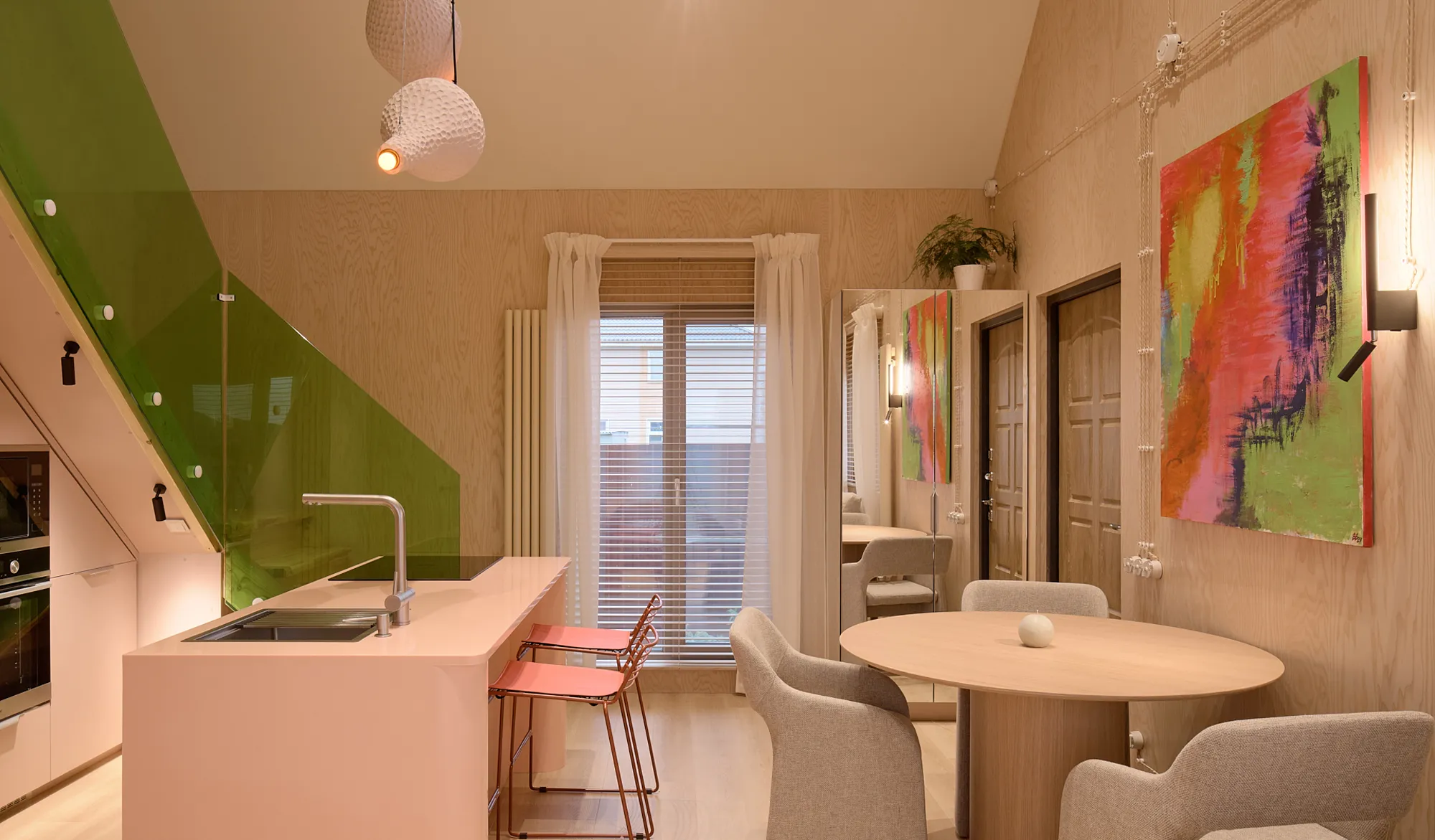 Чтобы визуально расширить пространство, дизайнеры установили два окна в пол. Одно из них оставили нетронутым, так как под ним разместился диван, а напротив — телевизор, который можно смотреть с трех точек: дивана, обеденного стола и полубарных стульев острова. Обеденный стол выбрали круглой формы, что делает его максимально удобным для каждого члена семьи. Планировка рассчитана до миллиметра, чтобы обеспечить комфорт во всех зонах — будь то гостиная, кухня или столовая.
