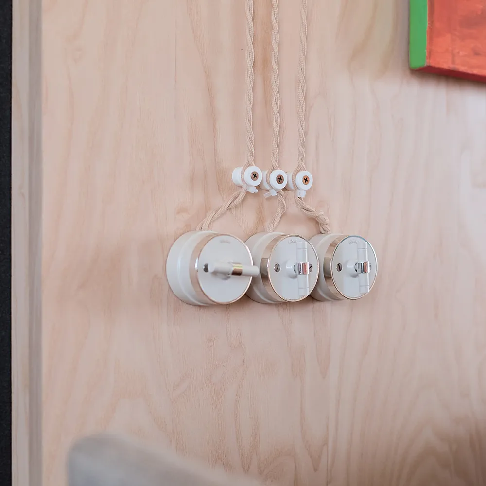 Проводку решили не прятать в стену, а пустить по верху. Витой кабель в стиле ретро, благодаря специальной пропитке, гармонично сочетается с деревянной отделкой. Ретро-проводку дополнили выключателями и розетками с хромированными вставками из коллекции Vintage, которые стали завершающим штрихом в создании уникального интерьера.